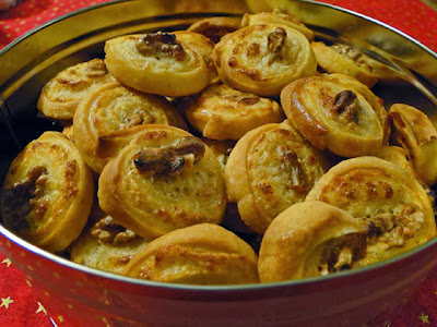 Těsto rozdělíme na dvě části. Každou vyválíme na tenký plát a potřeme polovinou náplně. Stočíme do rolády a dáme do ledničky ztuhnout. Potom nakrájíme na centimetrová kolečka rozložíme na plech vyložený pečícím papírem potřeme rozšlehaným vajíčkem ozdobíme kouskem ořechu a pečeme na 200 stupňů do růžova.