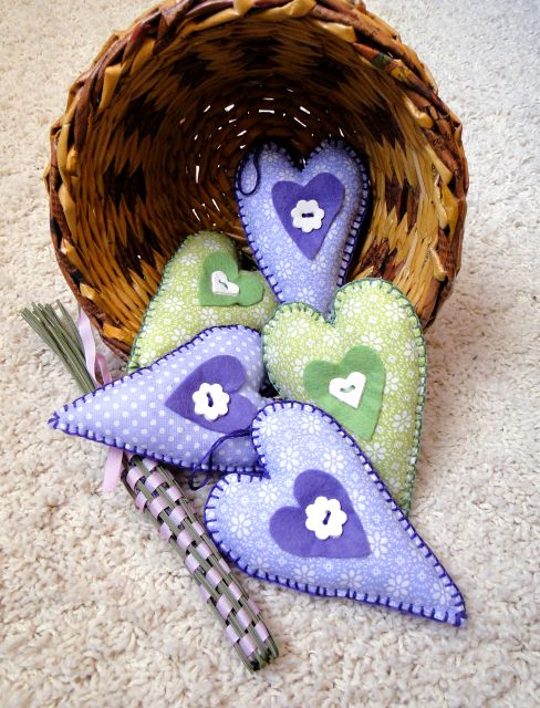 Tato srdíčka jsem šila jako dárky pro kamarádky. Jsou plněna částečně dutým vláknem a částečně sušenou letošní levandulí a jak krásně voněla! Doma mi nezbylo ani jedno, budu si muset ještě nějaké spíchnout na provonění skříní :))